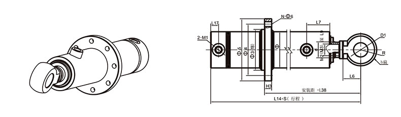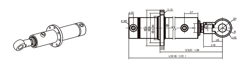 活塞桿端為外螺紋桿頭耳環(huán)連接
