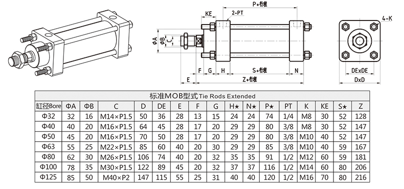 標(biāo)準(zhǔn)型MOB輕型拉桿液壓油缸外形安裝尺寸圖