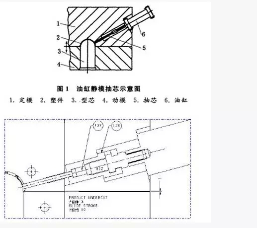 定模抽芯用油缸驅(qū)動(dòng),大大簡(jiǎn)化模具結(jié)構(gòu),降低成本;但需注意動(dòng)作順序的控制和滑塊鎖緊,以免動(dòng)作錯(cuò)亂損壞模具或油缸鎖緊力不足而無法封膠,抽芯力不足而抽不動(dòng)滑塊。
