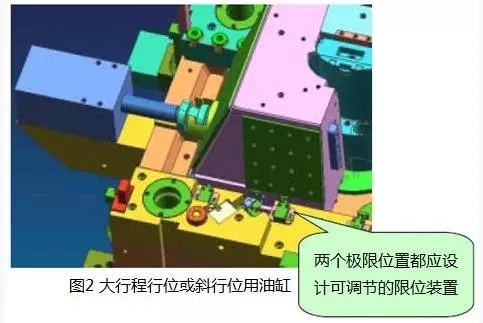 在模具結(jié)構(gòu)中油缸應(yīng)有行程限位控制開關(guān),確保活塞端隙;同時(shí)應(yīng)具備模具生產(chǎn)時(shí)自動(dòng)控制所必須的信號(hào)源。